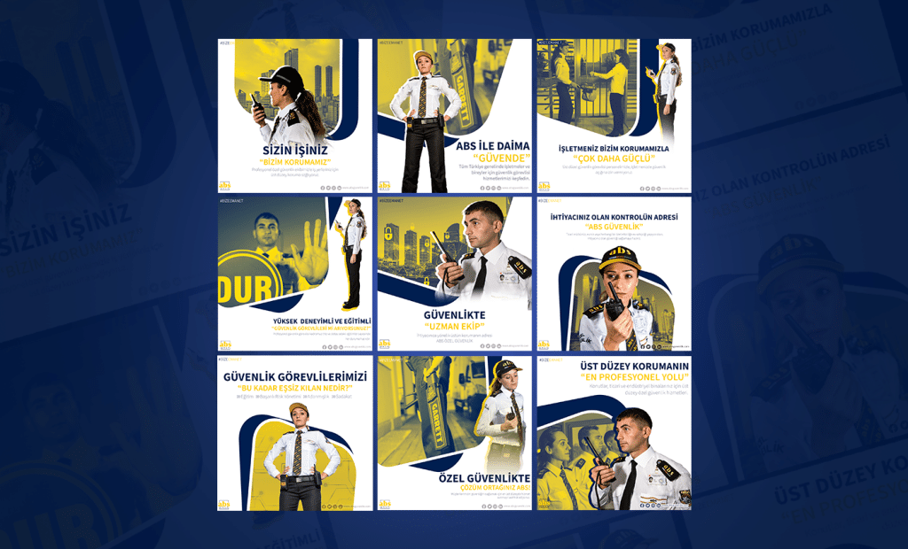 ABS Güvenlik markasının profesyonel ve güvenilir imajını yansıtacak sosyal medya tasarımları hazırladım. Tasarım sürecinde markanın kurumsal renk paleti (lacivert ve sarı) temel alınarak güçlü, dinamik ve güven duygusu uyandıran bir görsel dil oluşturuldu. Amaç, markanın sunduğu özel güvenlik hizmetlerini tanıtırken profesyonellik, disiplin ve güven değerlerini ön plana çıkarmaktı. Her bir görsel, kurumsal iletişime uygun sloganlar ve dikkat çekici tipografiyle desteklendi.