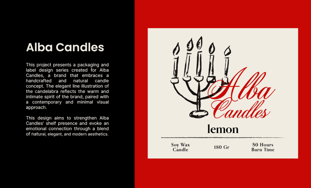 Alba Candles markası için hazırlanan bu çalışma, markanın el yapımı ve doğal mum konseptini yansıtan bir ambalaj ve etiket tasarımı serisidir. Tasarımda kullanılan zarif çizgi illüstrasyonları, mumun sıcak ve samimi ruhunu modern bir yorumla birleştirir. Marka ismi için seçilen kırmızı ton, enerji ve tutku hissi yaratırken; sade tipografi ve krem tonlarındaki arka plan, doğallık ve minimalizm vurgusunu destekler. Farklı koku seçenekleri — lemon, mint, strawberry — için tasarlanan ambalaj ve etiketler, bütünsel bir marka kimliği oluştururken her bir ürüne özgün bir karakter kazandırır.