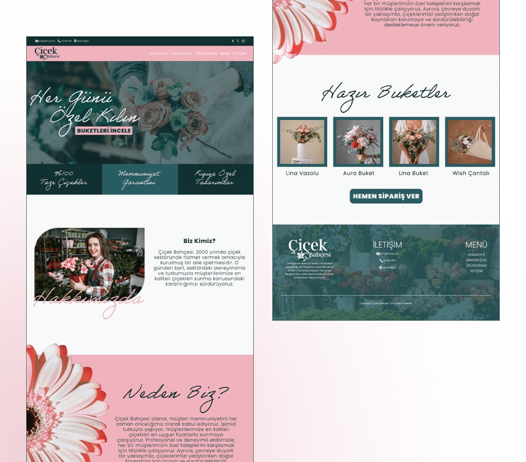Butik çiçek tasarımı ve özel aranjman hizmetleri sunan bir çiçek dükkanı için sıcak, zarif ve kullanıcı dostu bir web sitesi tasarladım. Tasarımda markanın samimi ve doğal atmosferini yansıtmak için pastel renk paleti, el yazısı tipografiler ve yumuşak görsel geçişler kullandım. Kullanıcıların hazır buketleri kolayca inceleyebilmesi, sipariş oluşturabilmesi ve iletişim bilgilerine hızlı erişebilmesi amacıyla sade ve akıcı bir sayfa yapısı planlandı. Web sitesi, tüm cihazlarda uyumlu görüntüleme sağlayacak şekilde responsive olarak tasarlanmış olup Adobe XD ile prototiplenmiştir.