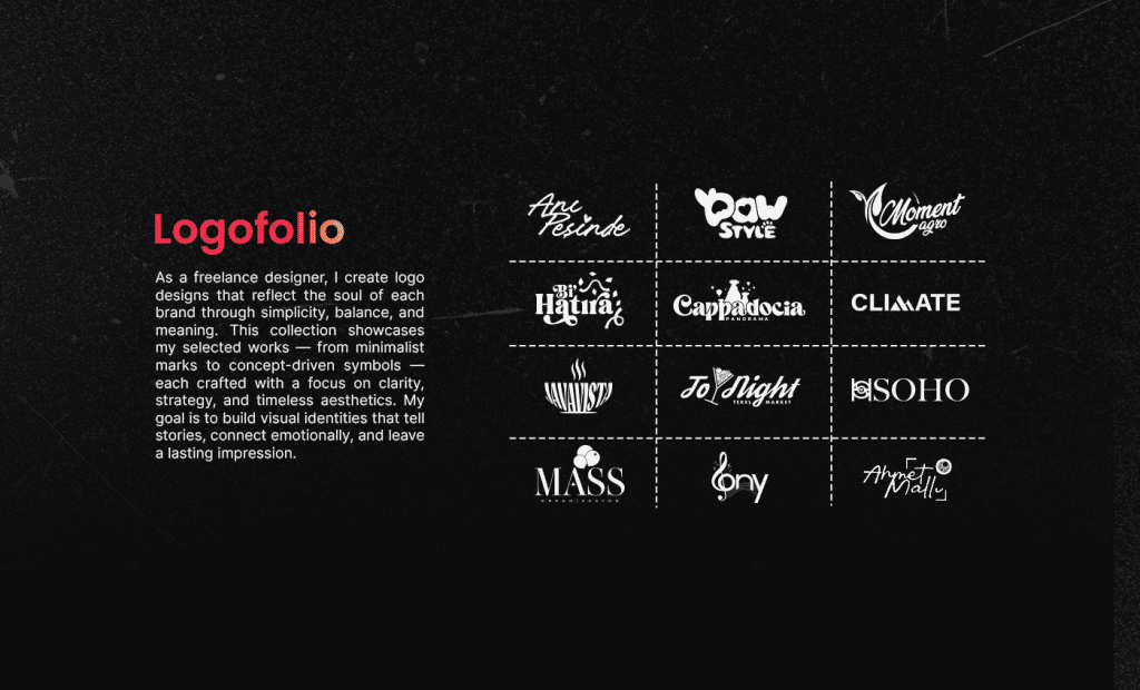 Bir freelance tasarımcı olarak, her markanın ruhunu sadelik, denge ve anlam üzerinden yansıtan logo tasarımları oluşturuyorum. Bu koleksiyon, minimalist çizgilerden konsept odaklı sembollere kadar özenle tasarlanmış seçili çalışmalarımı içeriyor. Amacım; hikâye anlatan, duygusal bir bağ kuran ve kalıcı bir etki bırakan görsel kimlikler tasarlamak.