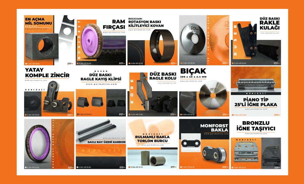 Her tasarım; makine parçalarının işlevini, dayanıklılığını ve üretimdeki önemini vurgulayacak şekilde planlandı. Markanın kurumsal renk paleti ve yalın iletişim dili korunarak, hedef kitleye güven veren ve teknik yeterliliği öne çıkaran bir görsel bütünlük oluşturuldu.