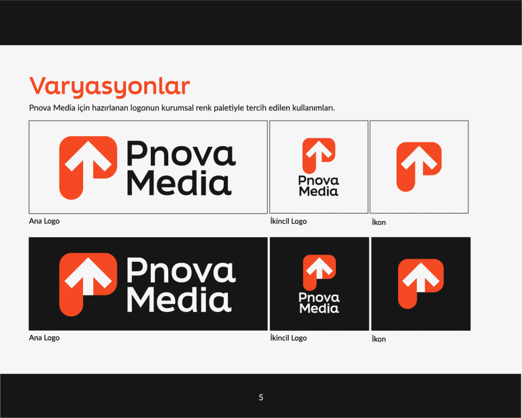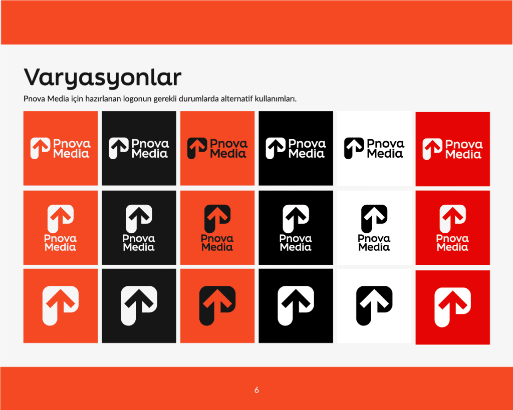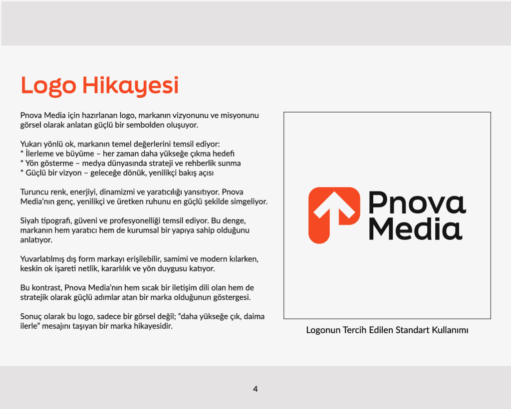 Pnova Media için hazırlanan logo, markanın vizyonunu ve misyonunu görsel olarak anlatan güçlü bir sembolden oluşuyor. Yukarı yönlü ok, markanın temel değerlerini temsil ediyor: * İlerleme ve büyüme – her zaman daha yükseğe çıkma hedefi * Yön gösterme – medya dünyasında strateji ve rehberlik sunma * Güçlü bir vizyon – geleceğe dönük, yenilikçi bakış açısı Turuncu renk, enerjiyi, dinamizmi ve yaratıcılığı yansıtıyor. Pnova Media’nın genç, yenilikçi ve üretken ruhunu en güçlü şekilde simgeliyor. Siyah tipografi, güveni ve profesyonelliği temsil ediyor. Bu denge, markanın hem yaratıcı hem de kurumsal bir yapıya sahip olduğunu anlatıyor. Yuvarlatılmış dış form markayı erişilebilir, samimi ve modern kılarken, keskin ok işareti netlik, kararlılık ve yön duygusu katıyor. Bu kontrast, Pnova Media’nın hem sıcak bir iletişim dili olan hem de stratejik olarak güçlü adımlar atan bir marka olduğunun göstergesi. Sonuç olarak bu logo, sadece bir görsel değil; “daha yükseğe çık, daima ilerle” mesajını taşıyan bir marka hikayesidir.